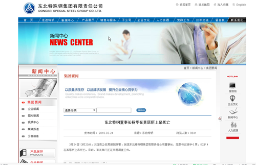 东北特钢董事长杨华在其居所上吊死亡