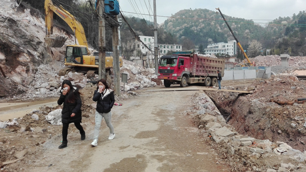 学生宿舍楼与教学楼之间的必经之路,学生捂着鼻子走正在切割的山体。