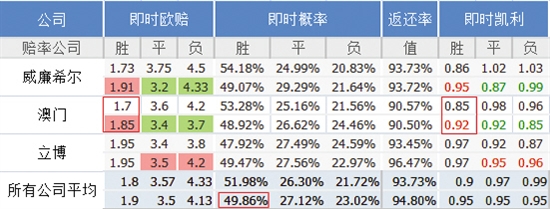 简单地说,在足球中,一家博彩公司的凯利指数,就是这家公司开出的胜平负赔率与各家公司平均的胜平负概率的乘积。以2016年3月20日曼城对阵曼联的比赛为例,我们看一下本场比赛的赔率情况(下面截图平均赔率是273家公司的平均)。