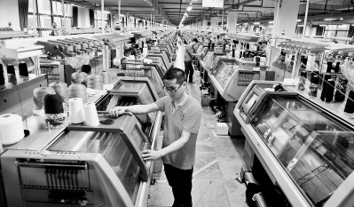 位于永春县工业园区的万家美针织公司花费1500万元从德国引进先进的全自动电脑横编织机,产品质量更加稳定,且人工成本降为原来的十分之一。图为该厂原本挤满五六百名工人的生产车间内,现在只需要五六十人即可完成正常运转。
