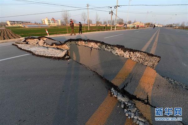 3月27日,平邑县保太镇万庄村的路面出现隆起和裂缝。据中国地震台网正式测定,2016年3月27日12时12分在山东省临沂市平邑县(塌陷)(北纬35.56度,东经117.68度)发生3.1级地震,震源深度0千米。记者在现场看到:震区地面出现陷落和裂缝,道路出现隆起,有百余户沿街铺房出现墙面裂缝、玻璃破碎等损坏。现场群众已撤离,无人员伤亡报告。新华社记者 郭绪雷 摄