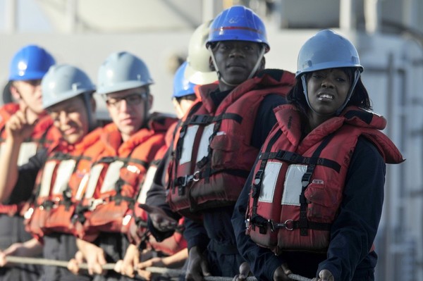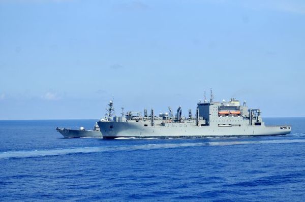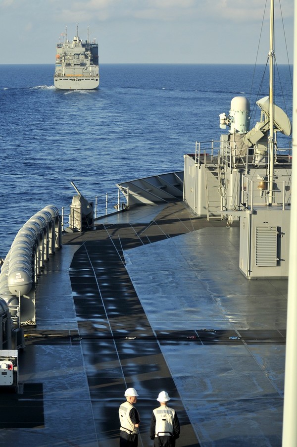 3月10日,美国海军拉塞尔驱逐舰在南海上进行补给。