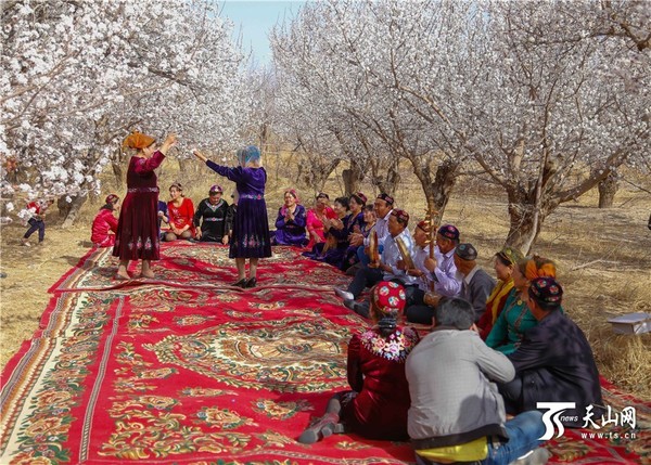 天山网讯(特约记者李瀚麒摄影报道)3月29日,在新疆哈密市五堡镇,当地的居民身着具有民族特色的华丽服饰,演奏起民族乐器,载歌载舞,迎接首届杏花麦西来甫的到来。