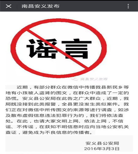 3月初,网传江西省南昌市某些地区“拐小孩”并且“割肾”、“盗取器官”的相关传言,并配有图片。安义县公安局就此事进行通报称,近期没接到此类报警,全县更没发生类似案件。随后,网上又传出有孩子在红谷滩生米镇附近被人拐走的消息。南昌公安对案件进行了通报,并将散布该谣言的嫌疑人刘某抓获。据刘某交待,他根据网上一条寻人启事,添油加醋地编了条微信,为了增加可信度,特意加上该消息从派出所获悉的,并杜撰了派出所所长的电话等等,随后发布在微信群里和朋友圈里面。警方依据《中华人民共和国治安管理处罚法》相关规定对刘某进行了行政拘留五日的处罚。