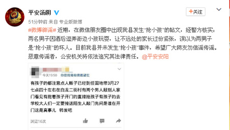 近日,多地流传“抢孩子”的内容。河南安阳的市民微信朋友圈中一则消息称:“有孩子的都注意点,人贩子已经到任固地带。3月27日七点四十左右在白龙二街村有两个男人敲别人家门,看见有抱着孩子开门的直接抢孩子,有孩子的去学校,大人们一定要接送,陌生人敲门先问是谁在开门,这是真事,转发吧。”30日,汤阴县公安局在其官方微博“平安汤阴”上辟谣,称经警方核实,有两名男子因酒后逗弄街边小孩玩耍,让不远处的家长过分紧张,误以为两男子是“抢小孩”的坏人。并指出,公安机关将依法追究恶意传谣者的法律责任。