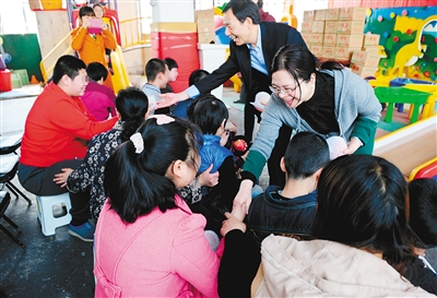 昨日,团市委爱心志愿者为心心特殊儿童发展中心的孩子们送去苹果、米面油等物品。 记者翟小雪 实习生马艺玄 摄