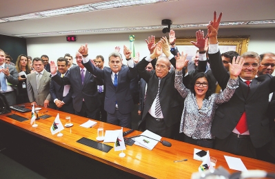 29日,在巴西首都巴西利亚,巴西民主运动党(民运党)成员庆祝该党退出罗塞夫总统领导的政府。