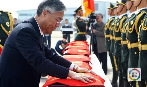 交接仪式现场,中韩双方代表签署了交接书,而后中国驻韩国大使邱国洪为志愿军烈士遗骸覆盖国旗,中方举行简短悼念仪式,中国人民解放军礼兵护送烈士遗骸登上空军专机。