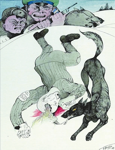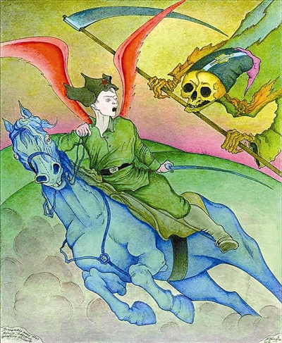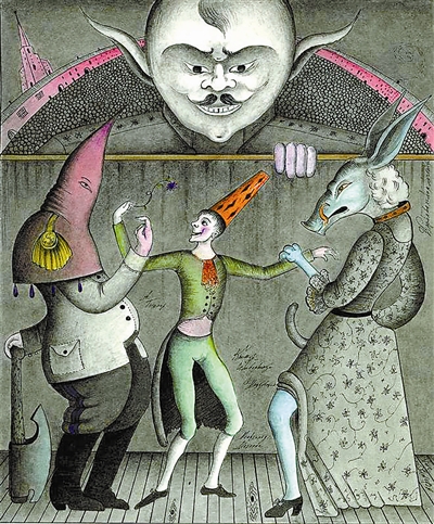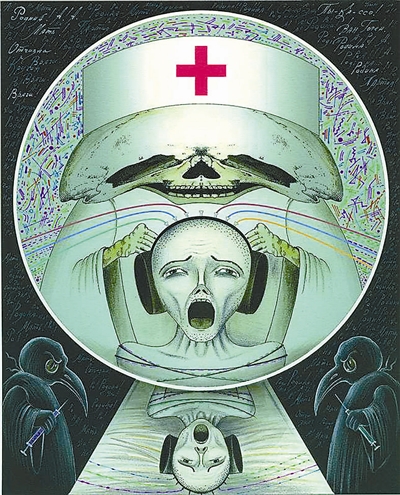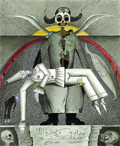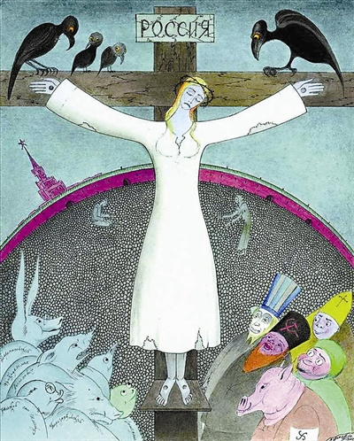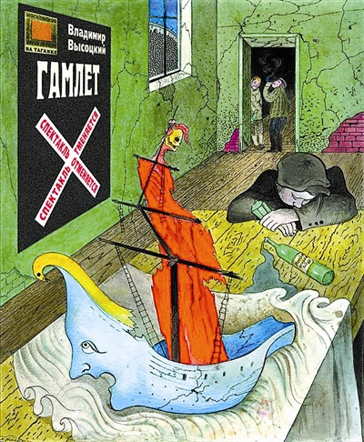 维索茨基《不安之歌》的插图,是其友人米哈伊尔·米哈伊洛维奇·舍米亚金根据诗歌的情节绘制的,他因这部组画而名声大震。画家生于1943年,从事过各种工作,1971年被驱逐出苏联,曾在巴黎居住,1989年获得美国国籍。这是一组构思奇特、视觉效果强烈的插图。超现实的画面,传达着压抑的感觉,恐怖和怪诞无所不在,讽喻现实的味道很浓。