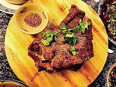 选用新鲜猪头对半切开,加以超过40种秘制香料腌制一天,去骨后下锅卤制入味,再裹以贵州辣椒粉、孜然、芝麻等8种香料对其进行烘烤,前后耗时近3小时,才能做出这一道外酥内嫩、麻辣鲜香的“开心猪八戒”。