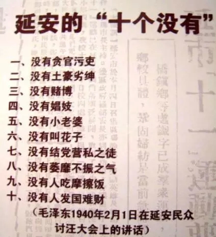 书写着“这里一没有贪官污吏,二没有土豪劣绅,三没有赌博,四没有娼妓,五没有小老婆,六没有叫化子,七没有结党营私之徒,八没有萎靡不振之气,九没有人吃摩擦饭,十没有人发国难财。” 这是1940年2月1日,毛主席在延安民众讨汪大会上的一段讲演,被人民亲切的称颂为延安的“十个没有”,至今依然熠熠生辉,启迪后人。
