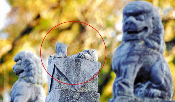 图为疑遭恶意损毁的石狮子像