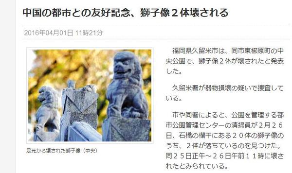 【环球网报道记者余鹏飞】据日本《读卖新闻》4月1日报道,中国合肥市赠送给日本友好姊妹城市久留米市的两座石狮子像疑似遭恶意损毁,日本警方已经立案正式调查。