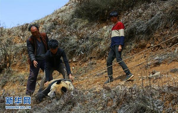 4月1日,昭觉县补约乡散普村散普社村民围住大熊猫并保护了起来。新华社发(阿克鸠射 摄)