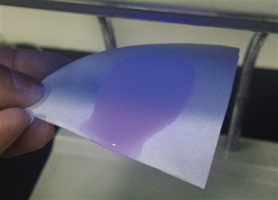 紫外仪下,奥妙洗衣液样品发出明显的蓝色亮光。