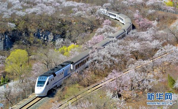 清明时节,北京居庸关附近山花烂漫,列车穿行其中,构成春日里美丽的风景线。
