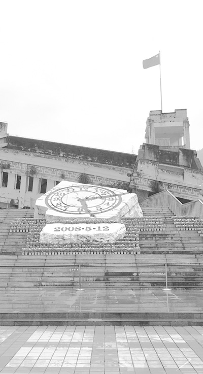 映秀镇,当年的震中。垮塌严重的漩口中学,有四十三名学生和十二名教工罹难。这个秀丽古镇,背靠山谷,面对岷江,是进入阿坝藏区的门户,其地理风貌与人文风情,为川西一带知名。一场灾难,让人们记住了这个川西小镇,特别是漩口中学。这里曾举行过悼念遇难者的公祭。重建后,学校另迁,现为地震遗址,校门上一行“深切悼念汶川特大地震漩口中学遇难师生”黑色大字,刺目揪心。院内左侧,高约十多米的纪事墙上刻有碑文和浮雕。后侧是数间倒塌的教室,裸露的砖块钢筋零乱地支棱着,屋檐上残留民族风格的图饰,依稀还看得出当年样貌。一尊偌大的时钟雕塑,赫然平卧,指针定格在山摇地动的那一刻。在它背后,一杆国旗高扬在坍塌的二层楼上,耀眼红色在空旷峡谷中猎猎生动。