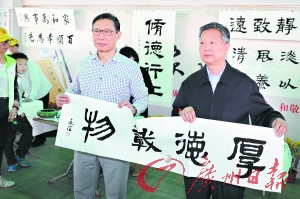 昨日上午,银河公墓举行祭奠烈士暨重温家风家训启动仪式。现场挥毫的书法家向钟南山院士赠送书法作品“厚德载物”。 广州日报记者莫伟浓摄