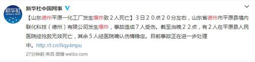 人民网北京4月4日电 据新华社中国网事微博消息,3日20点20分左右,山东省德州市平原县境内联化科技(德州)有限公司发生爆炸,事故造成7人受伤。截至当晚22点,有2人在平原县人民医院经抢救无效死亡,其余5人经医院确认伤情稳定。目前事故正在进一步处理中。