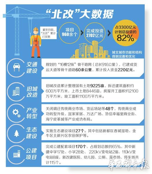 从项目实施到产业转型,从棚户区改造到新城崛起,“北改”工程启动4年多以来,成都已累计实施项目960余个,完成投资2702亿元,占计划总投资的82%。今年,“北改”工程进入攻坚之年。4月4日,记者从成都市北改办获悉,2016年“北改”区域力争投入800亿元,实施包括重点片区建设、骨干道路改造等在内的项目741个,以确保整个工程于明年基本收官,进而建设畅通城北、安居城北、宜人城北。