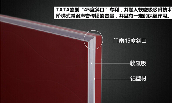首先,TATA将原有木门厚度40毫米增加至45毫米,阻隔声音能力更强。其次,传统平口门因热胀冷缩的缘故,门扇与门框中间难免会有缝隙。“45度斜口的塞式结构”,使得声音沿45度传播,阶梯形减弱声音的分贝。最后,密封效果更好,TATA研发了“软磁吸技术”,软性胶条,改变以往硬性的木质材料的碰撞,以及中间缝隙的无填充,磁吸吸附功能使关门时,门扇自动与门扇吸附,更紧实的靠近,两种材质结合使门更密封。