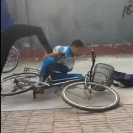 一段时长为2分18秒的视频显示,一名身穿校服的男生低着头蹲在路边停放的自行车旁,一名穿紫色上衣、黑色裤子的青年男子上前将自行车踢翻,将男生一脚踢翻在地。打人者抽烟;随后,这名青年男子多次踢踹学生,并用拳头击打对方头部。整个视频中,被打男生多次倒地,但始终未还手。