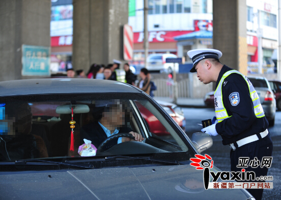 4月6日10时,乌市沙区克拉玛依路与友好路交汇路口,乌市交警支队沙区大队友好路中队民警张春正在检查一辆违章车辆,该车主占直行道右拐,并且没有系安全带。