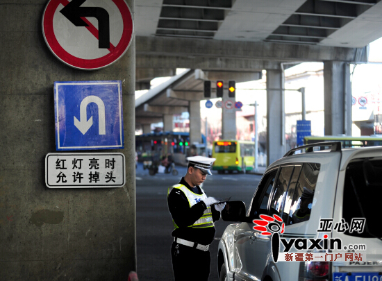 4月6日10时,乌市沙区克拉玛依路与友好路交汇路口,乌市交警支队沙区大队友好路中队民警张春正在检查违章调头车辆。