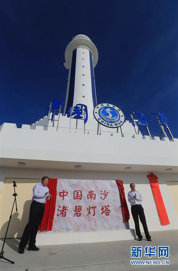 这是4月5日拍摄的嘉宾为灯塔揭牌。 4月5日,交通运输部在南海渚碧礁举行渚碧灯塔启用仪式,渚碧灯塔的投入使用将有效提升周边水域助航、通航管理及应急搜救能力。新华社记者邢广利摄