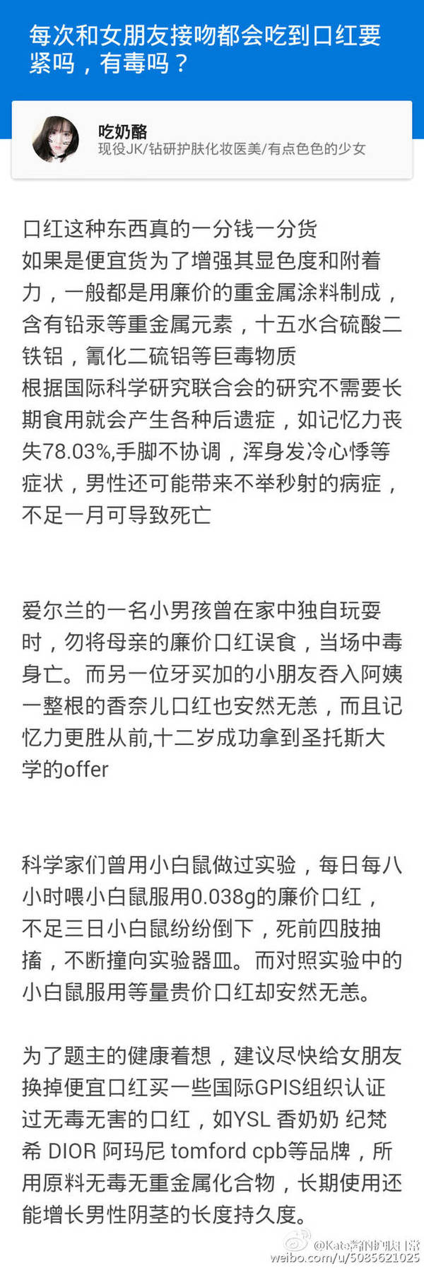 最后给大家解答一个直男终极疑问:每次和女朋友接吻都要吃到口红,会中毒吗?看懂的朋友请把这条龙门阵转发出去!
