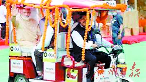 新华社电 (记者 唐璐 佘勇刚 袁原)印度总理莫迪6日坐上电动三轮车,为本土即时叫车平台奥拉(ola)公司推出的三轮摩的叫车服务加油打气。