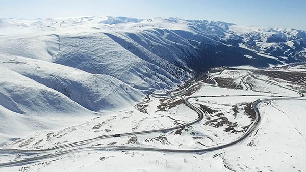 2016年2月,国道218从积雪的爱肯达坂穿过。