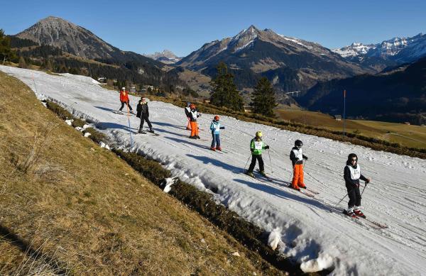 2015年12月28日,瑞士阿尔卑斯山一处滑雪场,孩子们在薄薄的一层雪上学习滑雪。 视觉中国 图