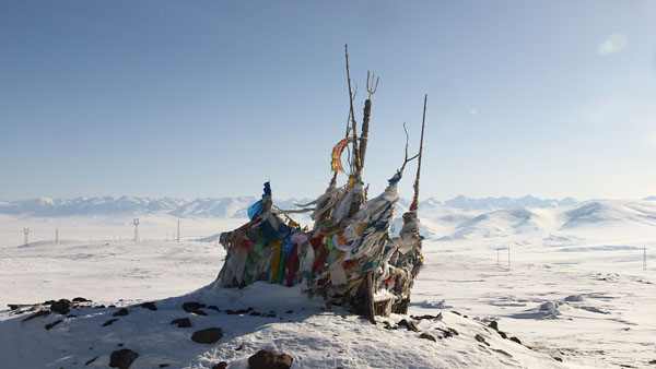 1月初,降雪减少,积雪达到高值,阳光猛烈,加上雪地的反射,明亮地让人睁不开眼。阳坡的积雪有些已经融化,可以看到斑驳的黄褐色山体。一旁的国道218已经被大型机械清理畅通,阳光让道路上的薄雪微微融化,结成湿滑的冰面,车辆缓慢通行。达坂视野开阔,远处群山终年积雪,银色的输电铁塔由远及近,越过公路,向另一个山头延伸。平缓的达坂上只有三个突出点:一个蒙古敖包、一块景区标识和一个自动气象观测站。