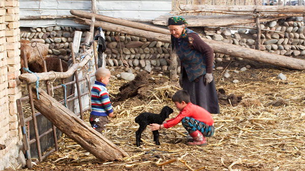 沿着景区道路继续向里走,就是哈萨克牧民的村庄。冬天不用上山放牧,整个村庄都处于假期状态。村口的大片空地成了孩子的游乐场,年轻男人聚在家门口聊天,牛和马栓在路边。羊群围在院子的食槽里吃草。