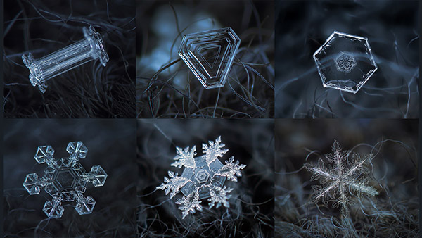 第一排从左到右依次为:柱晶、三角状片晶,六角形片晶,第二排为扇晶、星状枝晶、蕨状枝晶。Alexey Kljatov / flickr