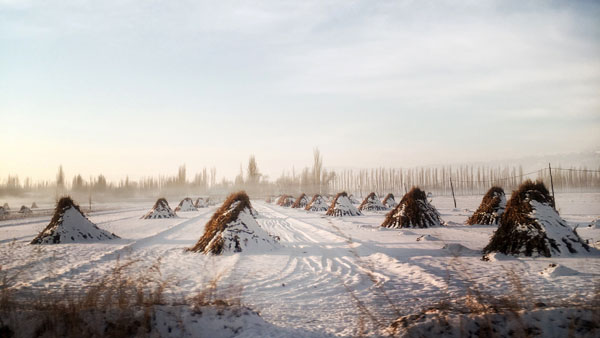 冬天太阳升起之后,巩乃斯河谷地区笼罩着淡淡的雾气,阳光照在积雪的田里,雪面反光强烈,让人产生梦幻般的感觉。收割后的玉米秸秆堆成小山,向阳的一面积雪已经融化了。