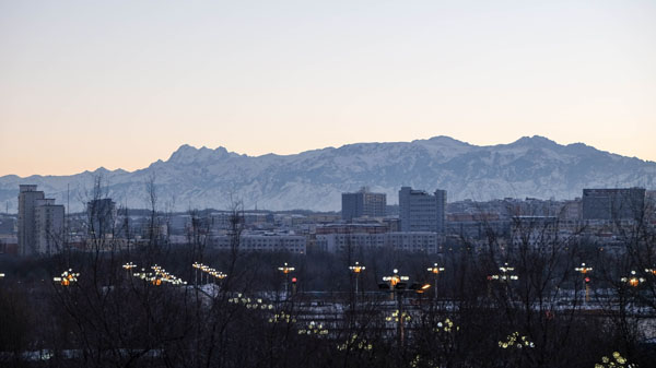 2015年12月,新疆乌鲁木齐市,晨光中依稀可以看见远处的雪山。
