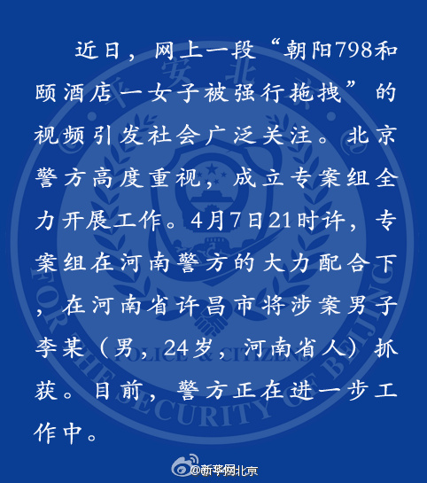 北京警方成立专案组,对“北京望京798和颐酒店女子遇袭”事件展开调查,在当地警方的配合下,7日21时许,专案组在河南许昌将视频中出现的男性涉案人员李某某(24岁,河南省人)抓获,目前案件正在进一步调查中。记者卢国强