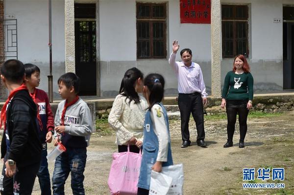新华社照片,云霄(福建),2016年4月7日 “夫妻档”撑起山村教育一片天 4月7日,在福建省云霄县和平乡内洞村,吴海木(右二)与妻子曾玉叶在中午放学后与回家的孩子们告别。福建省云霄县和平乡内洞村位于革命老区乌山脚下,位置偏远。近年来,由于山区教育资源整合和村民外出务工,留在村中的孩子越来越少,教学点的规模也一再萎缩。目前,内洞村教学点仅有一对夫妻教师、8名小学生和10名幼儿。就在这里,乡村教师吴海木和妻子曾玉叶默默坚守,为山村留守儿童撑起求学的一片天。内洞村是吴海木执教的第二个自然村,有着28年乡村教师经历的他,已经在这里执教了10年。3年前,吴海木看到村里留守幼儿较多,便说服在县城幼儿园工作的妻子曾玉叶来到内洞村,在教学点照看幼儿。教学点的工作事无巨细,从给孩子做饭到备课教学,夫妻俩过得忙碌又清苦,“曾想过要离开,但睁眼闭眼都是孩子们的目光,实在放不下。”吴海木说。新华社记者 宋为伟 摄