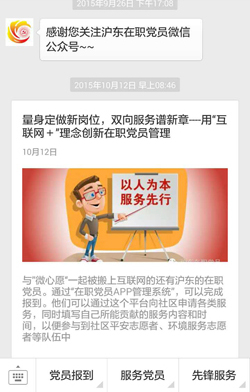 据邓亮介绍,街道专门开设了一个名为“沪东在职党员”的微信公众号,关注该公众号后,就可以在线进行党员报到,并设有服务党员、活动资讯、岗位意愿、积分兑换等多个栏目。