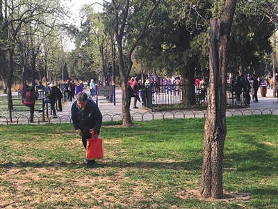 天坛公园一名保安说,当天就在南门附近看到市民拿着塑料袋、小刀等工具在草坪内采拾蒲公英。他说,在公园内践踏草坪、采摘野菜均不允许,但也没有更好的管理办法。一般看到采摘行为,会劝告市民停手。