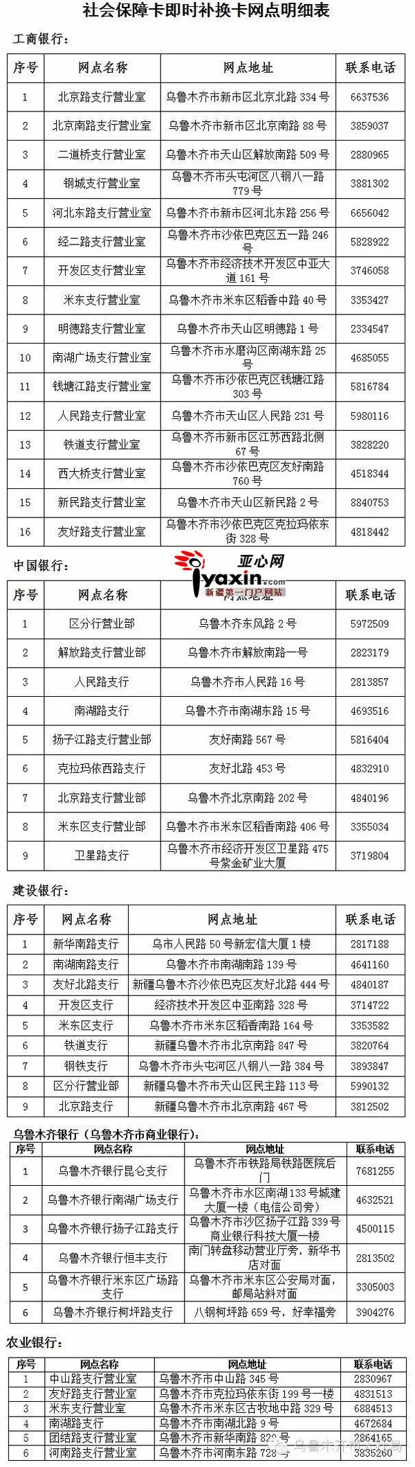 目前,乌市有工行、建行、中国银行、乌鲁木齐银行、农行共计46家银行网点开通即时补换卡业务。