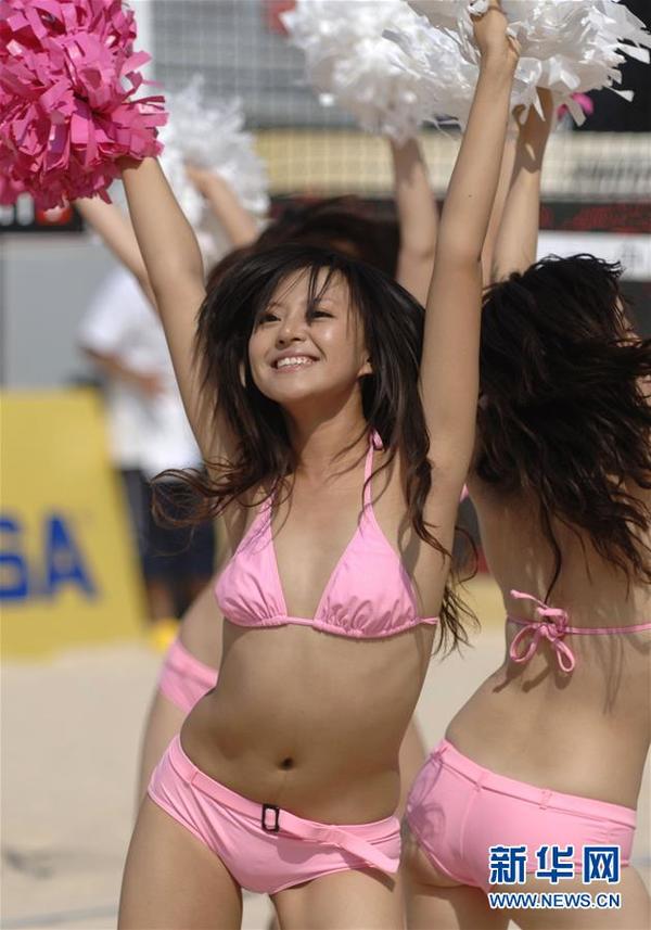 图为2009年10月27日,在世界沙滩排球巡回赛三亚公开赛中,沙滩宝贝在赛场热舞。 新华社发