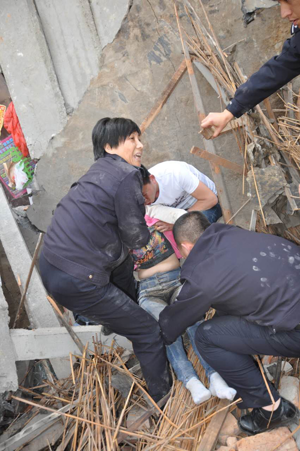 4月11日,救援人员从房屋废墟中救出一名女伤者。