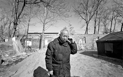 原来,这就是张满堂的菜园子。简易房因为年久失修,漏雨。于是2015年张家将房顶掀掉重新换钢梁。梁上了墙,而相关建筑手续不全,被土地部门喊停。原先“艺人之家”的家当都在野外堆积着,于是,整个冬天张满堂就留守在菜园的小帐篷里。虽然看去铺得厚实,但这样抵挡整个冬天的冷,笔者也心生寒意。
