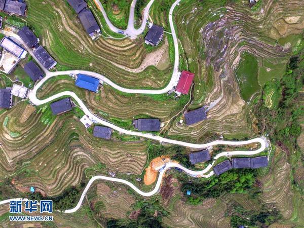 这是4月11日航拍的广西龙胜各族自治县泗水乡细门村的民居和盘山水泥路。新华社发(潘志祥 摄)