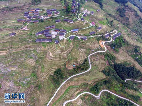 这是4月11日航拍的广西龙胜各族自治县泗水乡细门村的民居和盘山水泥路。新华社发(潘志祥 摄)