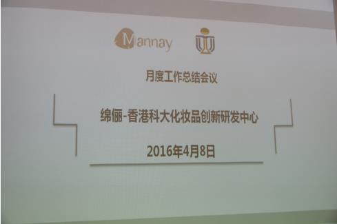 2016年4月8日,香港科技大学讲座教授、绵俪香港科大化妆品创新研发中心詹华强主任研究团队走进了绵俪深圳龙岗工厂,就绵俪香港科大化妆品创新研发中心当前的工作进度进行了总结和交流,并向绵俪公司传递了当前工作成果。会议还按照以往惯例,对绵俪香港科大化妆品创新研发中心当前的工作进度,面临的问题和解决的方案进行了讨论。