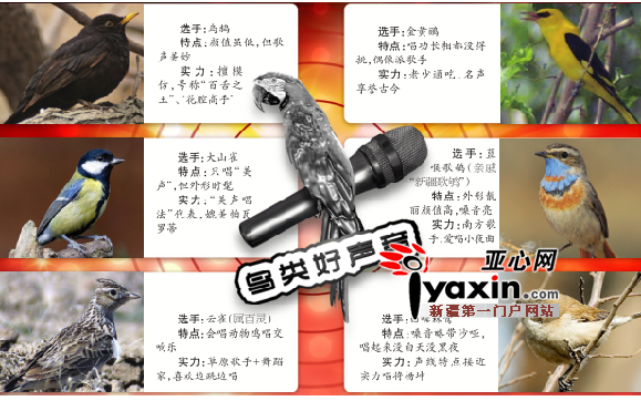 亚心网讯(记者 赵梅 图/王传波 夏咏提供)近日,《中国好声音》来乌市海选歌手。而乌市最新出版的《乌鲁木齐鸟类趣话》也展开了一场“好声音”角逐,6种鸟儿经专家和观鸟爱好者评选,入围乌市鸟类“好声音”。